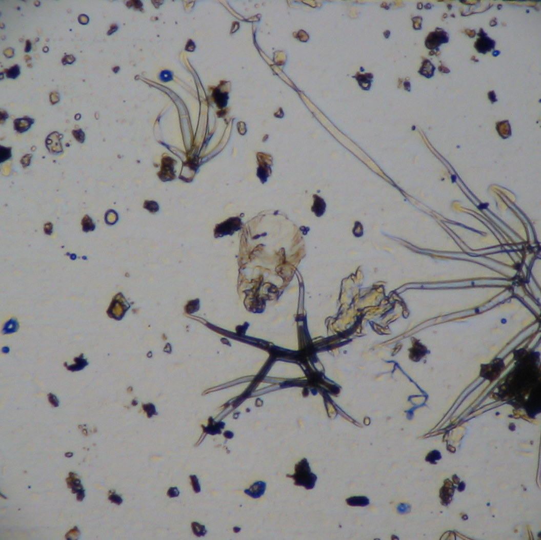 A dead bug (maybe a dust mite skin) among some trichomes and other junk
