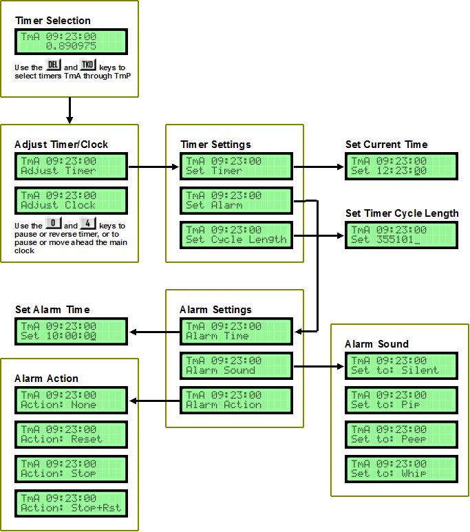 For more details, and some sample values (for example, how to make a timer run on Mars time), check Setting the Timer Cycle Length in the How-To section. Confirm the new cycle length with the button, or cancel the operation at any time by pressing the button.Alarm Settings [select timer, , select "Set Alarm", ]Each timer has an alarm associated with it. This menu will let you choose between the following options: