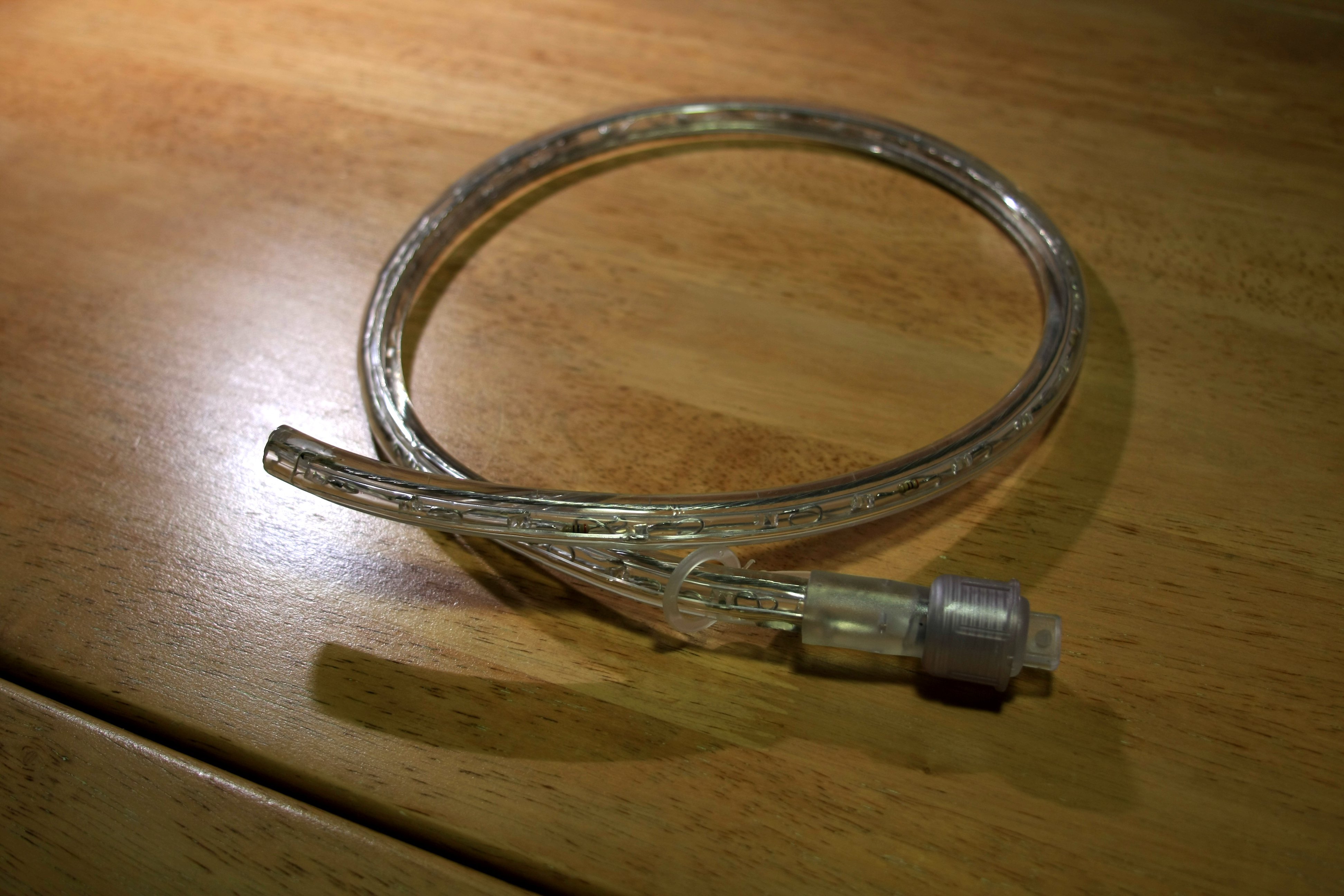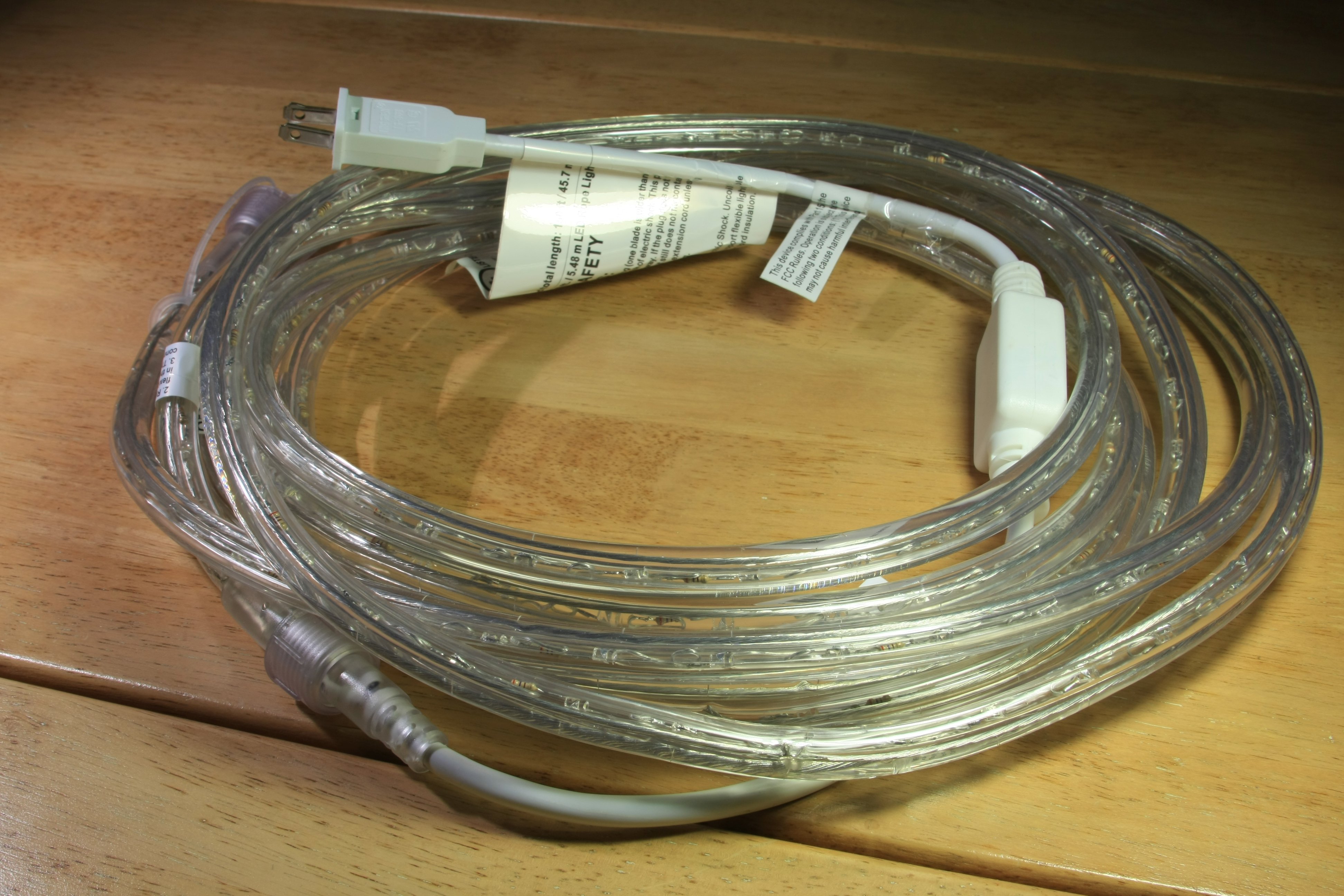 The rope is made of 210 high-brightness soft-white LEDs enclosed in a plastic tube: