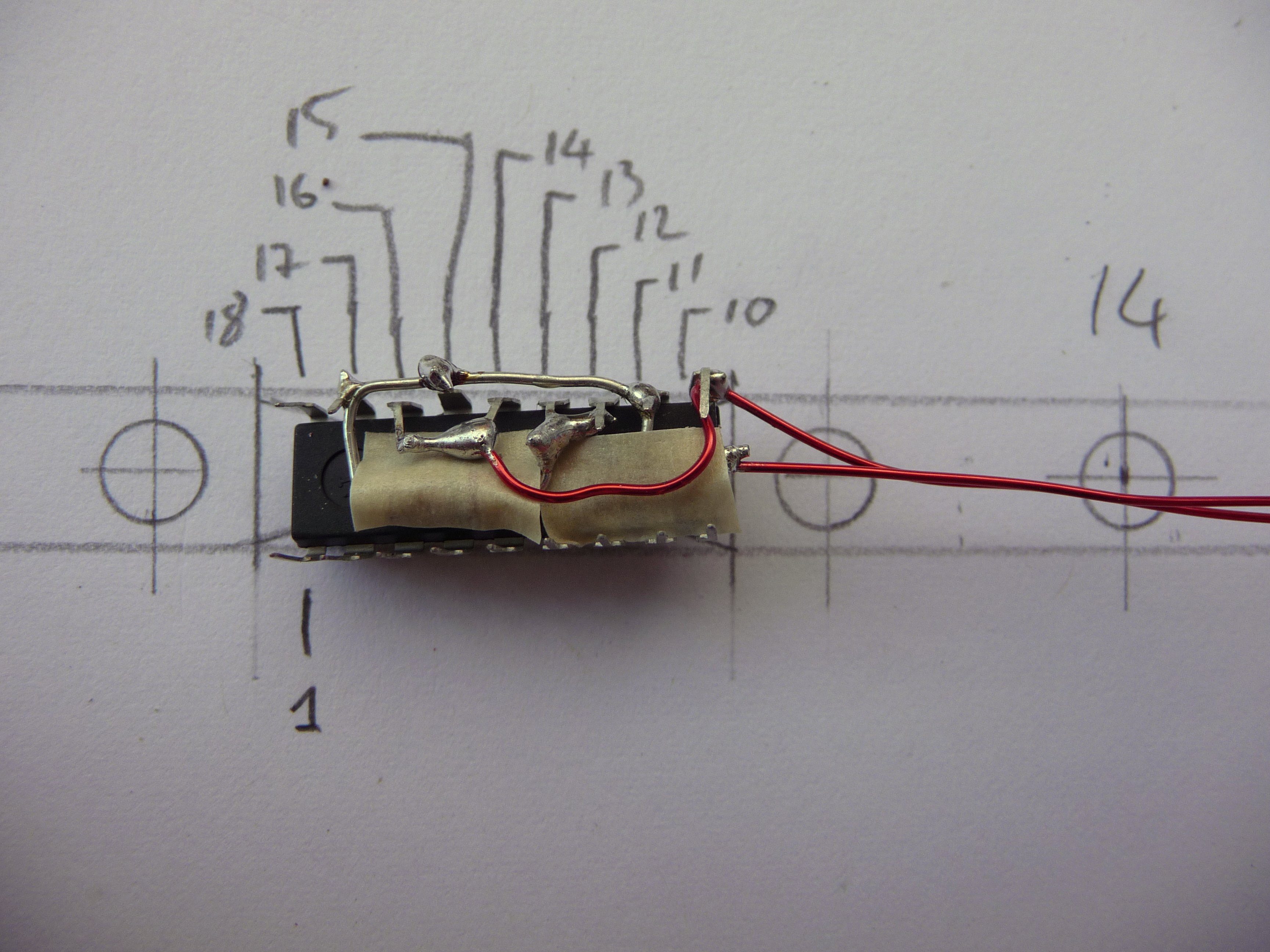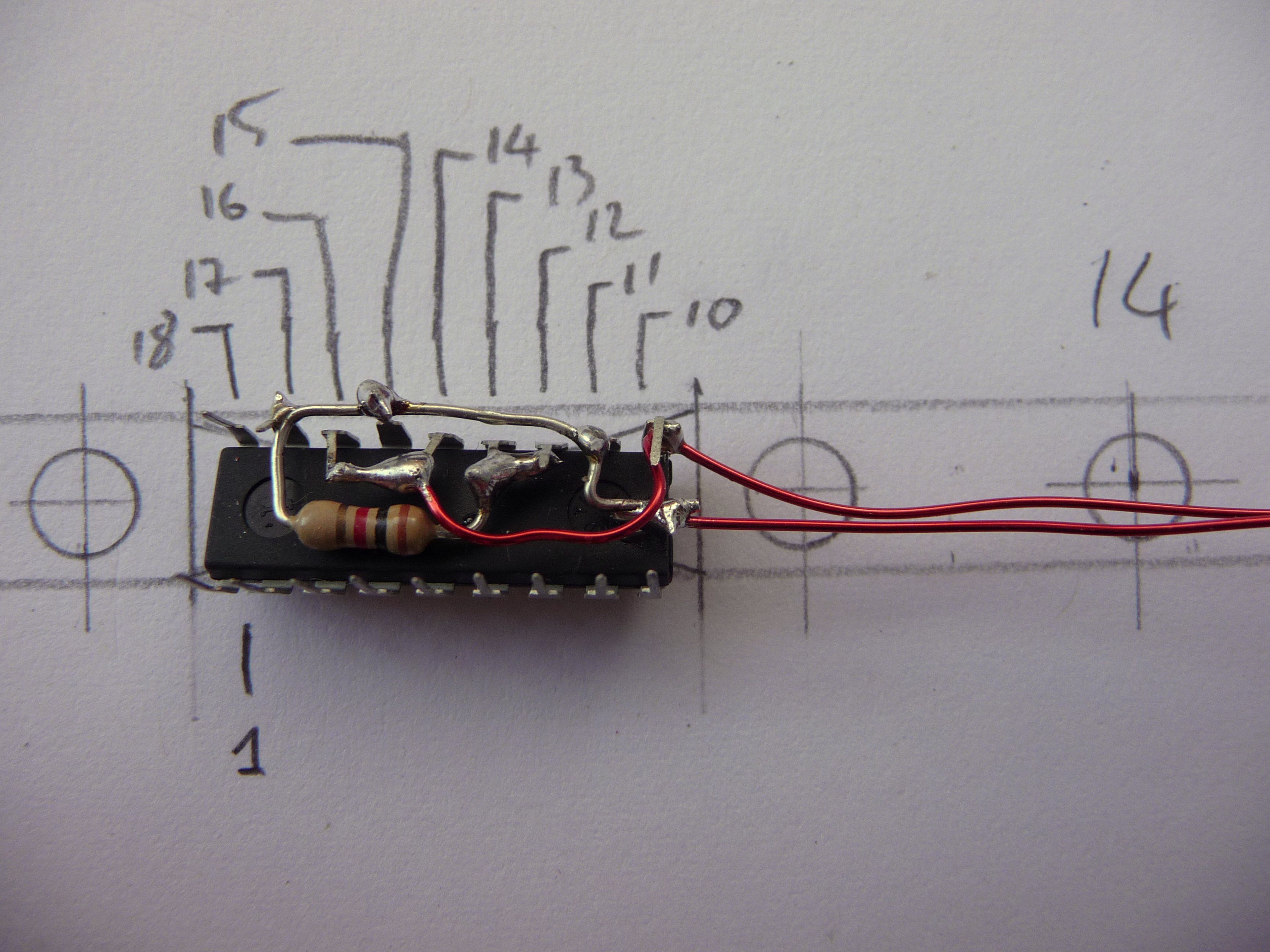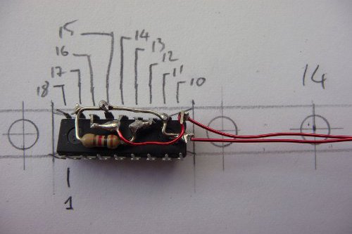 The new 12V light is also going to be in a rope. This means very limited space, so I had to embed the LM3914 in the rope too. To save space I soldered the resistor directly under the chip: