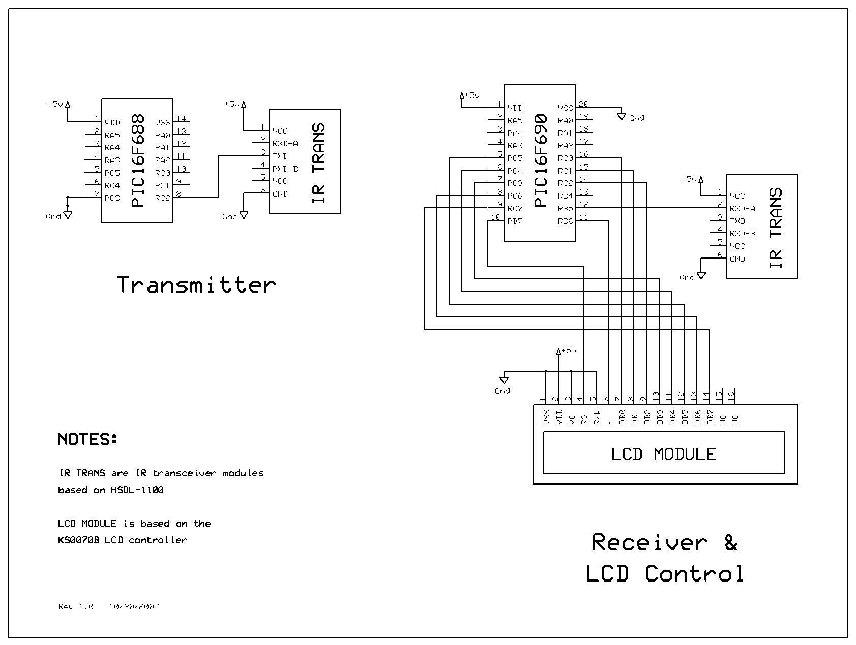 ![]() The receiver code and the LCD constants include file can be used without any change. The transmitter generates a moving two line "Hello World!" message. Note that transmitter was written for use with IR modules that invert pulse polarity - for direct connection pulse polarity must be inverted in the transmitter code.
