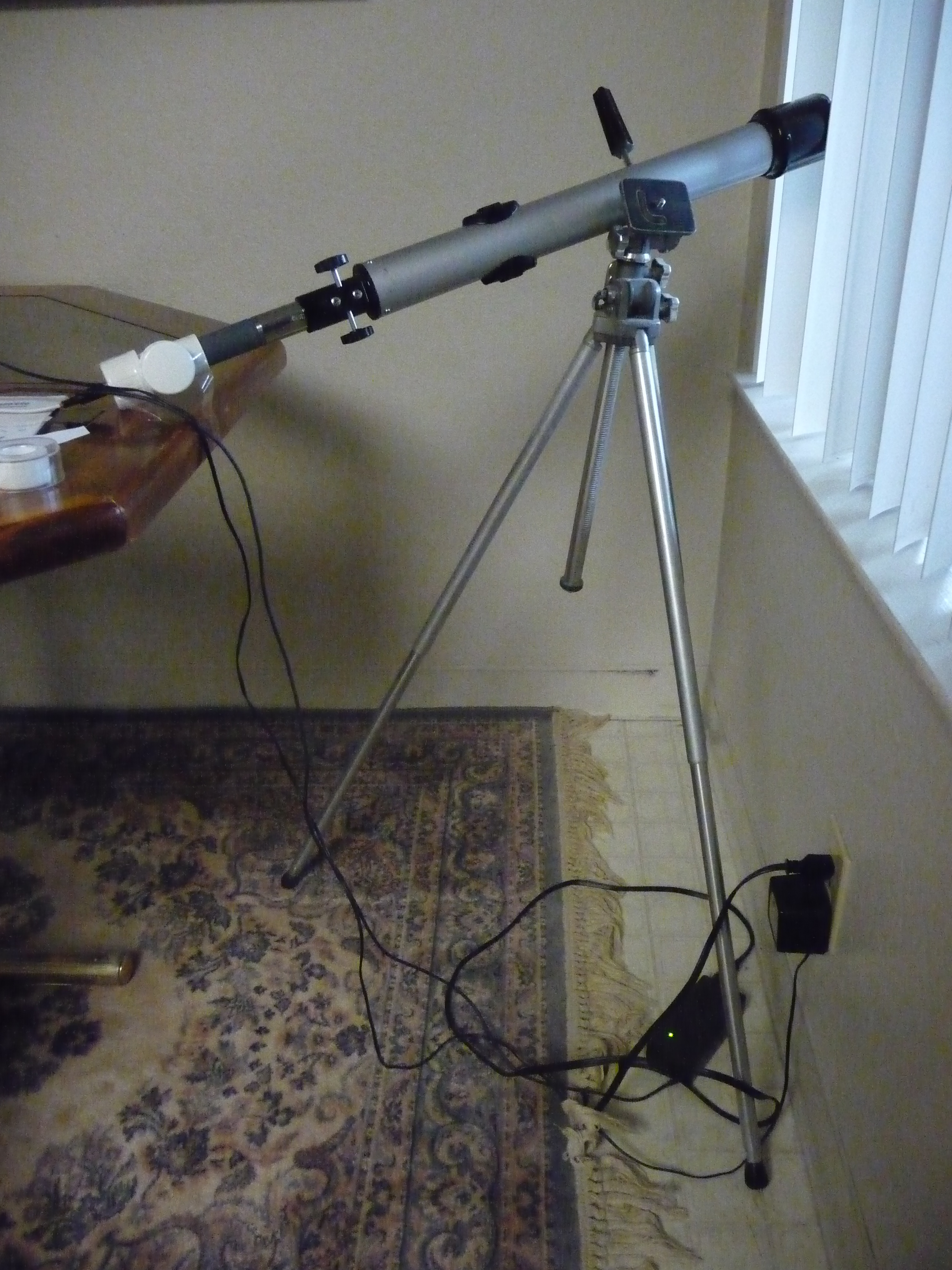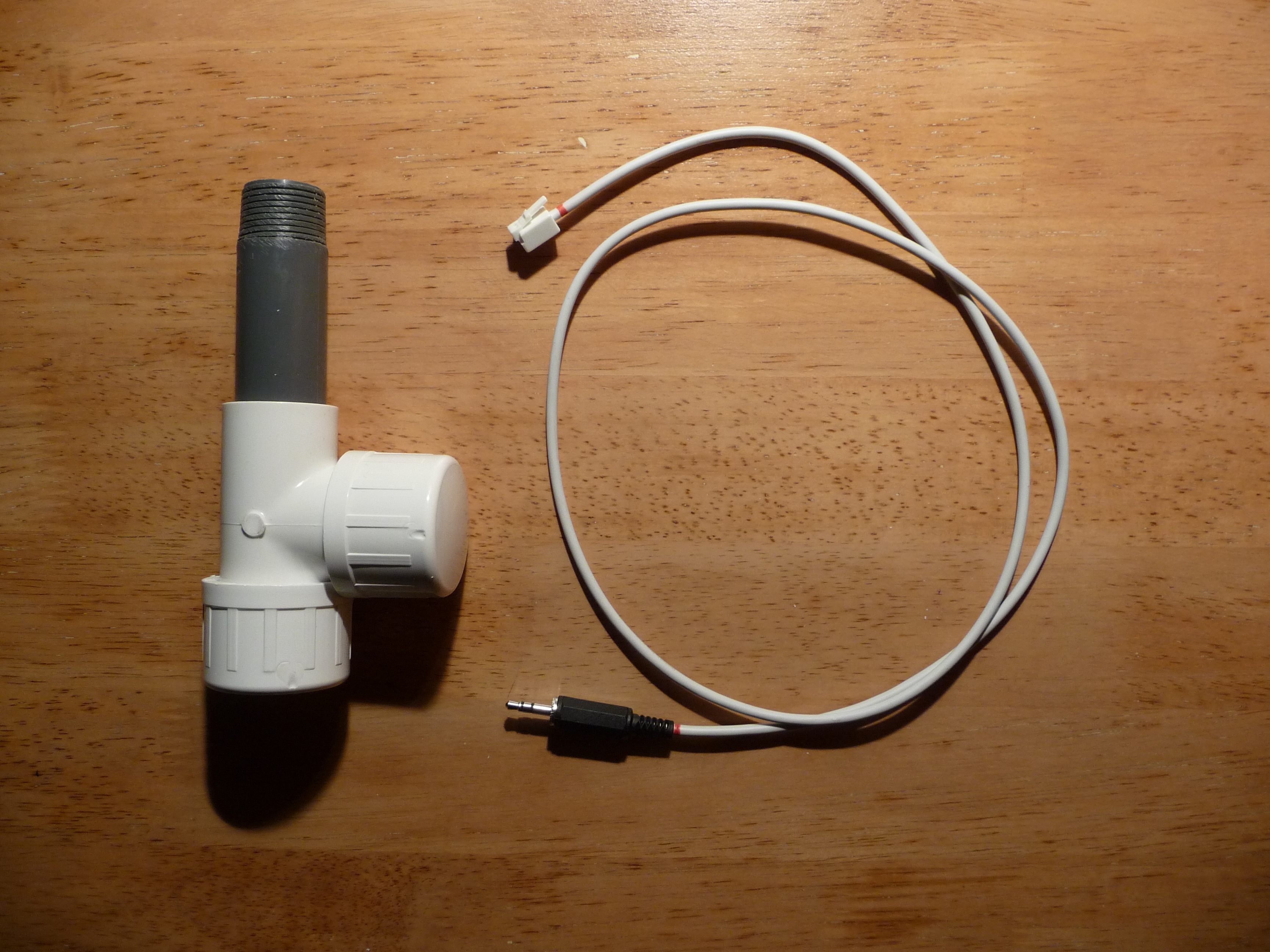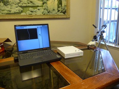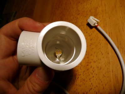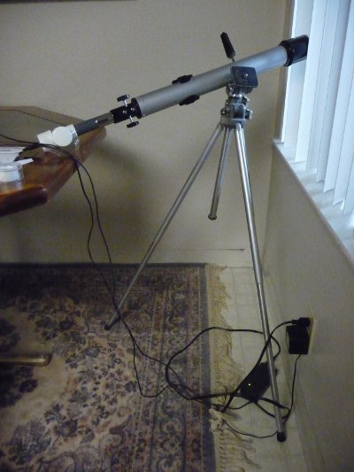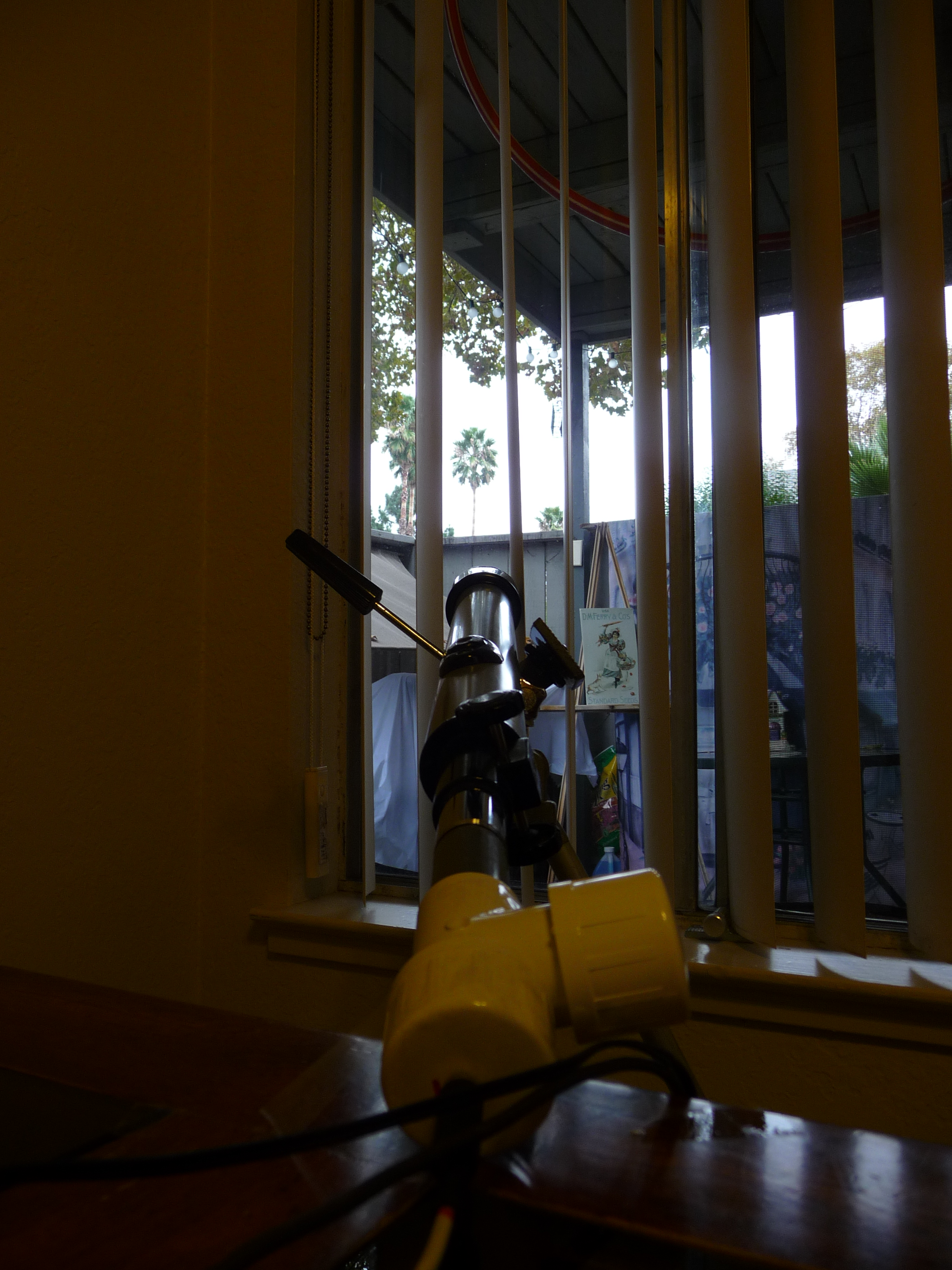 The photoresistor is mounted in a contraption made from PVC pipe and connects to the data logger through a five foot cable. The pipe diameter happens to fit perfectly in an old Tasco refractor telescope tube - this lets me point it very accurately at remote objects, like one palm about 200 feet from our patio: