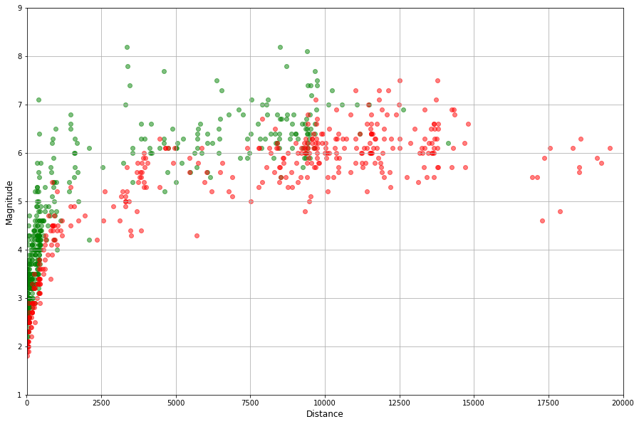 The plot shows the magnitude (on the Y-axis) and the distance in kilometers to the epicenter (on the X-axis). The green points are earthquakes that have been detected. Reds are the ones that the sensor did not detect (to be more accurate, we are talking about detecting the p-wave here).